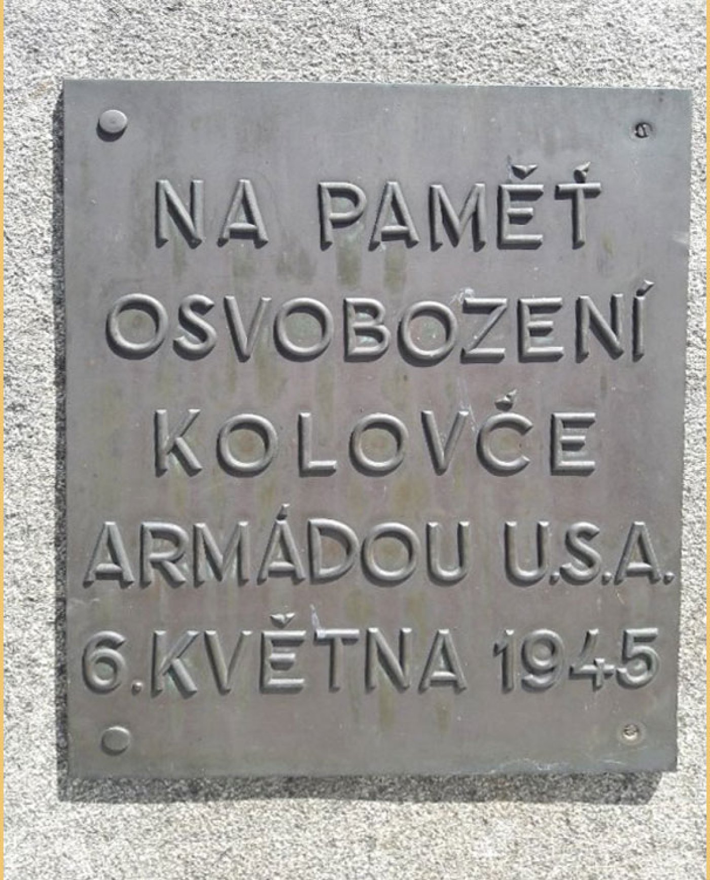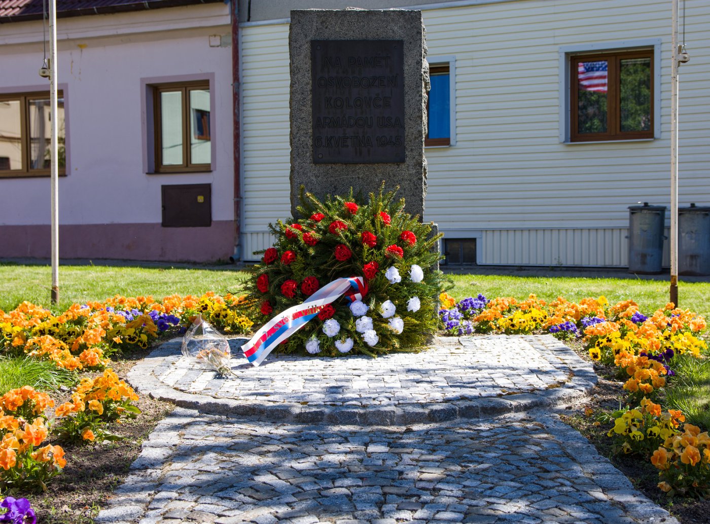 Pamětní deska s nápisem „Na paměť osvobození Kolovče armádou U.S.A. 6. května 1945”