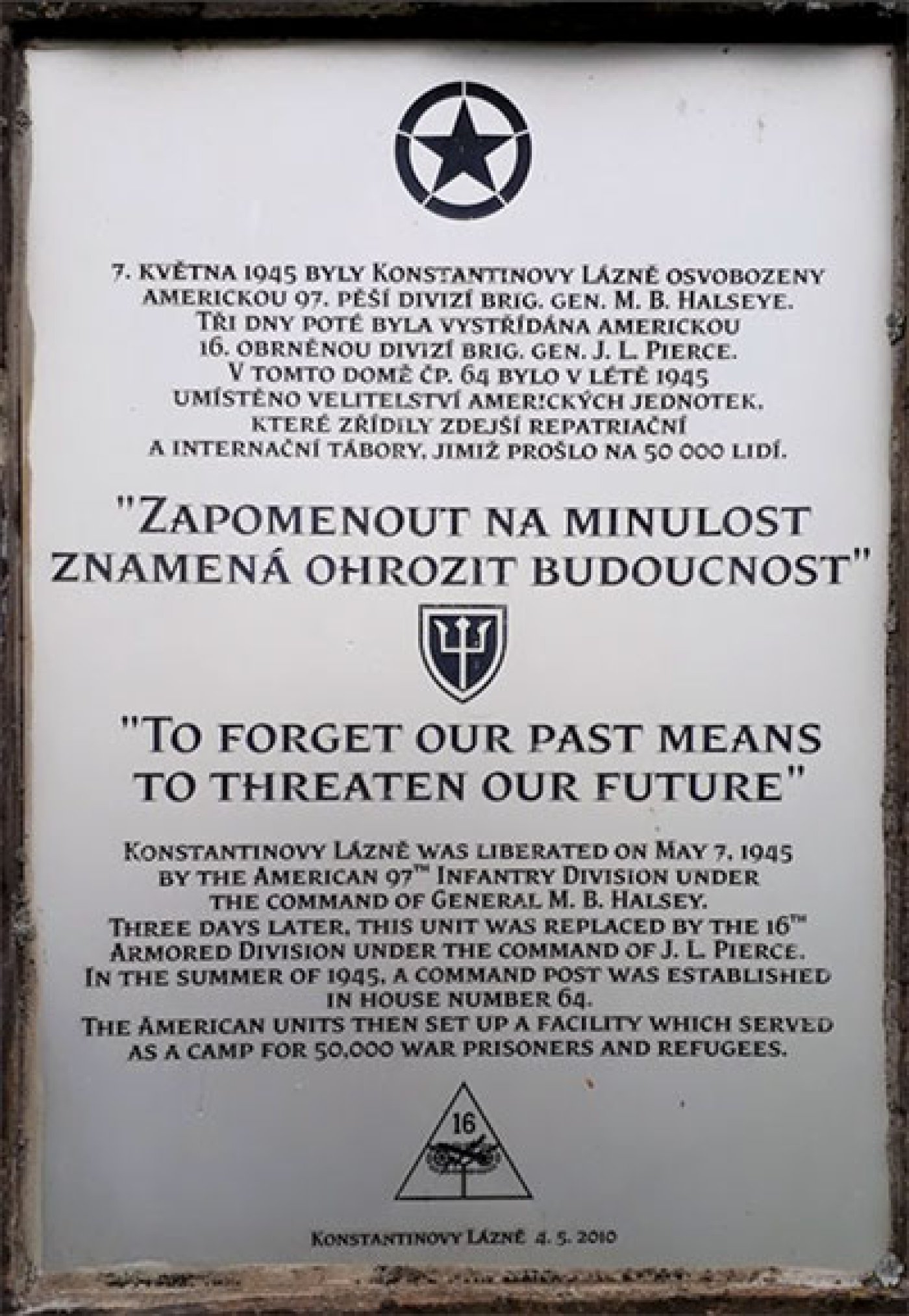 KVĚTNA 1945 BYLY KONSTANTINOVY LÁZNĚ OSVOBOZENY AMERICKOU 97. PĚŠÍ DIVIZÍ BRIG. GEN. M. B. HALSEYE. TŘI DNY POTÉ BYLA VYSTŘÍDÁNA AMERICKOU 16. OBRNĚNOU DIVIZÍ BRIG. GEN. J. L. PIERCE. V TOMTO DOMĚ ČP. 64 BYLO V LÉTĚ 1945 UMÍSTĚNO VELITELSTVÍ AMERICKÝCH JEDNOTEK, KTERÉ ZŘÍDILY ZDEJŠÍ REPATRIAČNÍ A INTERNAČNÍ TÁBORY, JIMIŽ PROŠLO NA 50 000 LIDÍ.