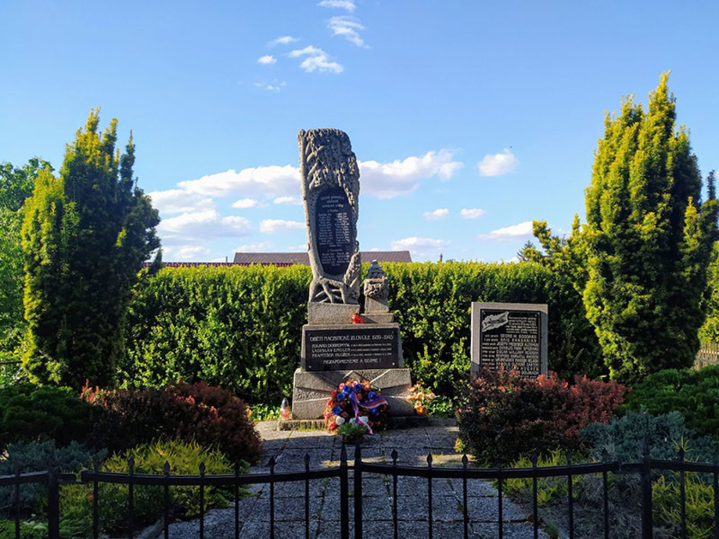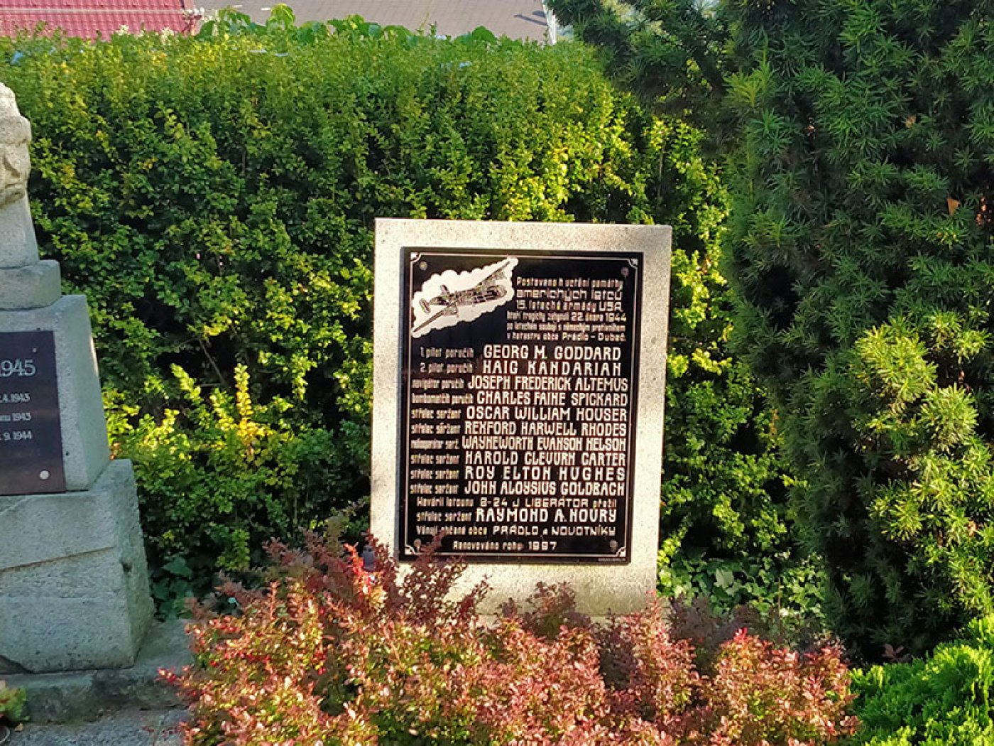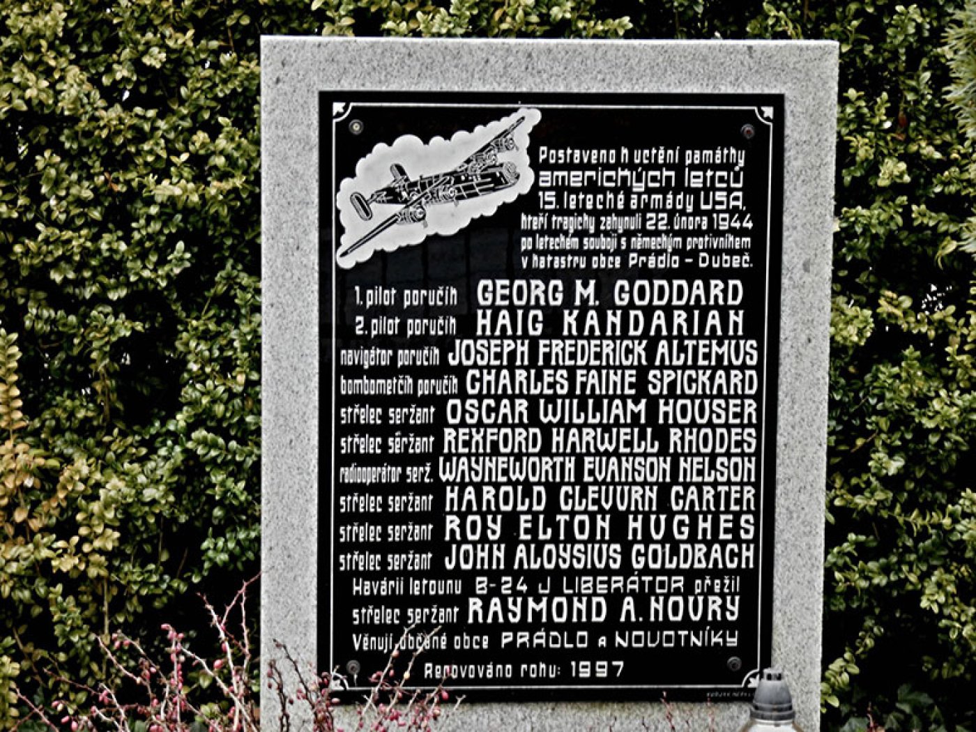 POSTAVENO K UCTĚNÍ PAMÁTKY AMERICKÝCH LETCŮ 15.LETECKÉ ARMÁDY USA, KTEŘÍ V TĚCHTO MÍSTECH TRAGICKY ZAHYNULI 22.ÚNORA 1944 PO LETECKÉM SOUBOJI S NĚMECKÝM PROTIVNÍKEM.