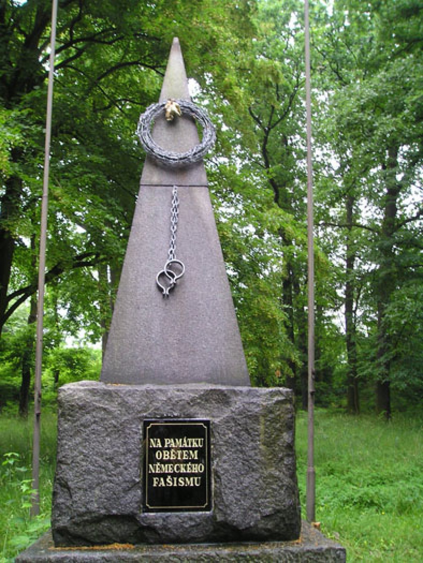 Pomník je čtyřstupňový, žulový a cca 360 cm vysoký. Spodní část podstavce je postavena z hrubě otesaných kvádrů. Další část je vyhotovena z několika velkých kvádrů. Třetí část tvoří jeden velký blok kamene a je na něm umístěna skleněná deska s nápisem. Nejvyšší část ve tvaru pravidelného čtyřbokého jehlanu o výšce cca 200 cm je vyrobena z umělého kamene a ozdobena kovovou trnovou korunou a okovy.