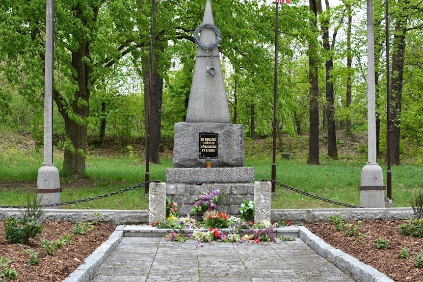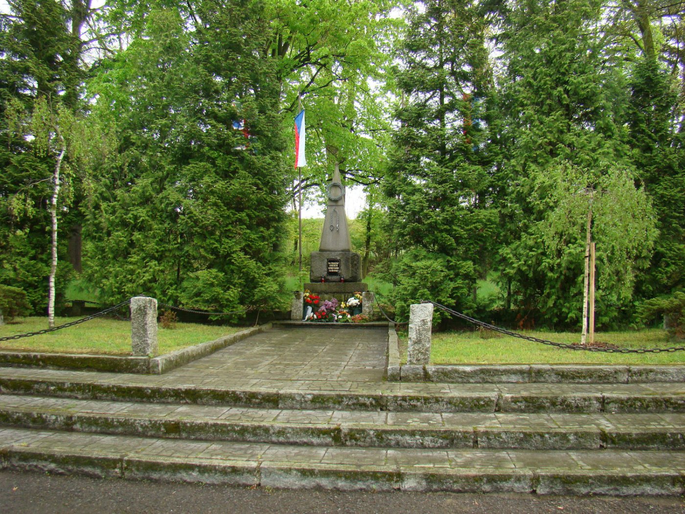 Pietní místo stojí v parku se vzrostlými stromy. Prostor před pomníkem je částečně asfaltový a částečně dlážděný. Bezprostředně před objektem jsou dvě plochy osázené menšími keři a místo je vymezeno kamennými sloupky a řetězy.